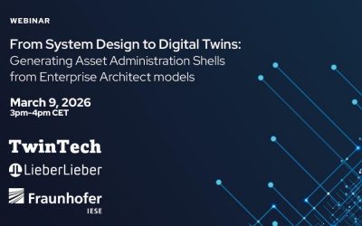 Together with our partners TwinTech and Fraunhofer IESE, we cordially invite you to attend the webinar ‘From System Design to Digital Twins: Generating Asset Administration Shells from Enterprise Architect models’ on Monday, 9 March 2026 (3:00 p.m. – 4:00 p.m.). Digital twins are still developed in parallel to existing engineering models, using specialized tooling for each artefact. Obviously, this reduces […]