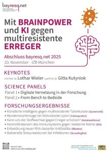 Zum Abschluss des Forschungsnetzwerks bayresq.net – Mit Brainpower und KI gegen multiresistente Erreger findet am 20. November 2025 die Abschlussveranstaltung dieses Zukunftsprogramms für Bayern statt. Freuen Sie sich auf hochkarätige besetzte Science Panels und Keynotes von Prof. Dr. Lothar Wieler und Prof. Dr. Gitta Kutyniok, sowie spannende Forschungsergebnisse aus 5 Jahren wegweisender AMR-Forschung auf Grundlage neuer Technologien. Die sechs beteiligten Projekte – […]