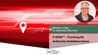 S1000D™ – Praxistag für technische Redakteur:innen23. April 2026, MünchenReferentin: Pia Grubitz An diesem Tag können Sie Ihr neues Wissen aus dem S1000D™-Grundlagen-Seminar (siehe: https://www.itl.eu/de/akademie/grundlagenseminar-zur-spec-asd-s1000dtm) praktisch üben. Wir erstellen und bearbeiten Datenmodule mit einfachen bis komplexen Strukturen. Als Werkzeug können Sie einen beliebigen XML-Editor verwenden. Falls Sie Arbortext Editor oder FrameMaker verwenden, kann ich Sie während des Seminars beim Einrichten der Arbeitsumgebung […]