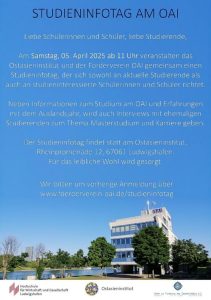 Sehr geehrte Damen und Herren, das Ostasieninstitut (OAI) der Hochschule für Wirtschaft und Gesellschaft Ludwigshafen veranstaltet am Samstag, dem 05. April, von 11 bis 15 Uhr einen Studieninfotag für alle, die Interesse am Bachelorstudiengang „International Business Management“ mit Schwerpunkt China, Japan oder Korea haben. Neben den betriebswirtschaftlichen und volkswirtschaftlichen Grundlagen umfasst das Studium eine vertiefende Auseinandersetzung mit dem Schwerpunktland (Sprache, Wirtschaft, Recht, Geschichte, Landeskunde). Zusätzlich verbringen […]